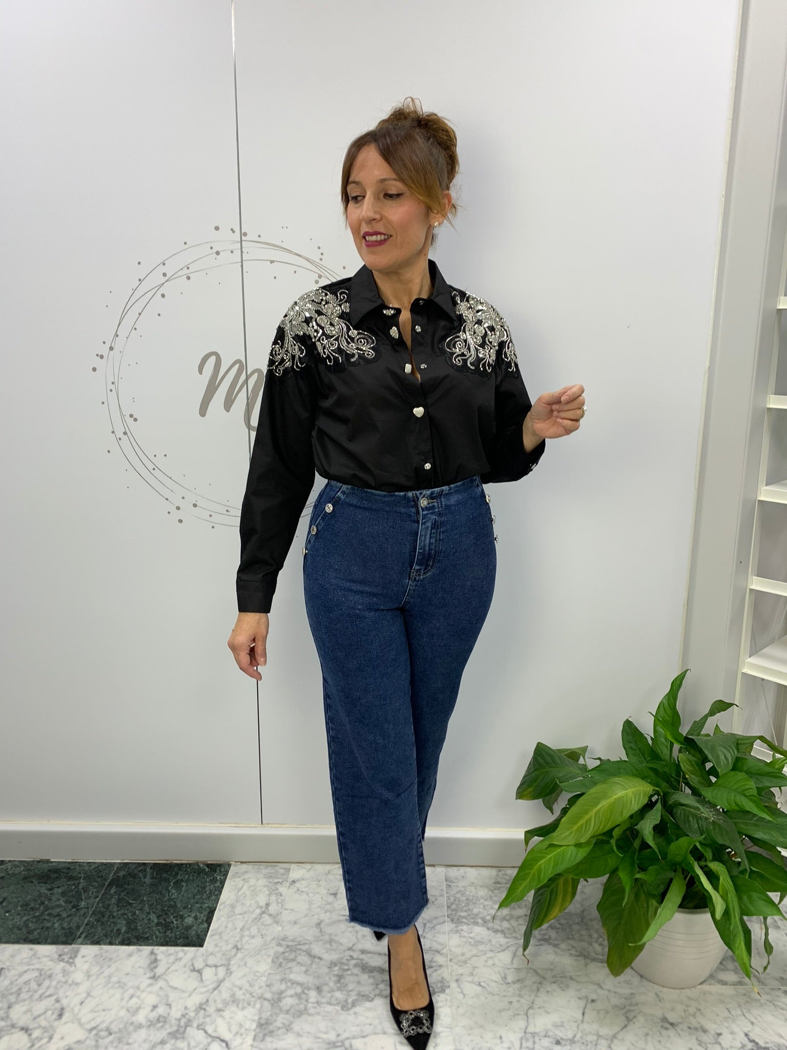 Una blusa estilo popelín negra con bordados de abalorios plateados en la zona del pecho y hombros es una prenda elegante y sofisticada. El popelín es un tejido ligero y suave, perfecto para prendas de vestir, que proporciona comodidad y un aspecto pulido.